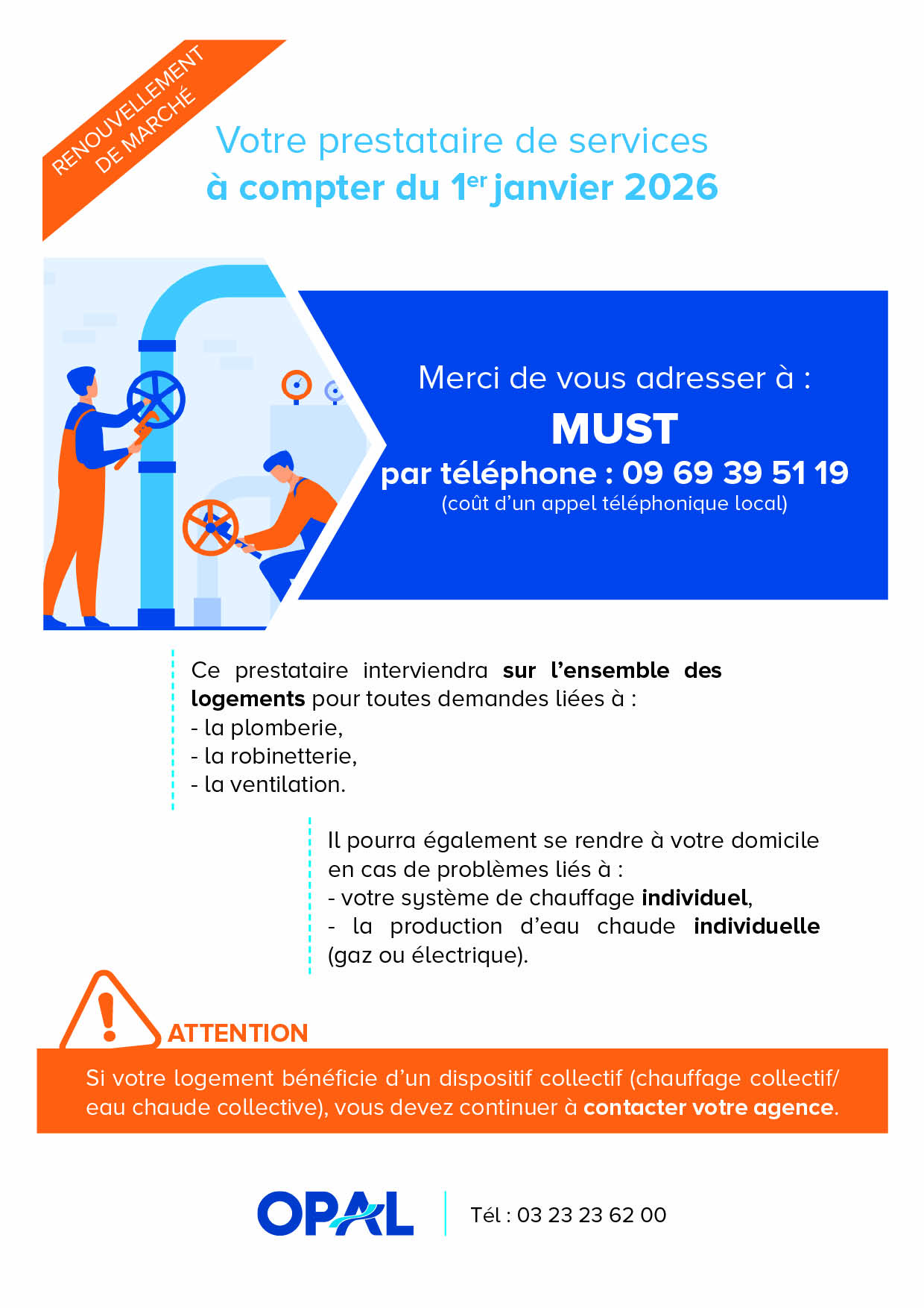 A compter du 1er janvier 2026, votre prestataire de service change. Sont concernées par le renouvellement de notre marché, les interventions en plomberie, robinetterie, ventilation et chauffage/production d’eau chaude (pour les logements individuels uniquement).